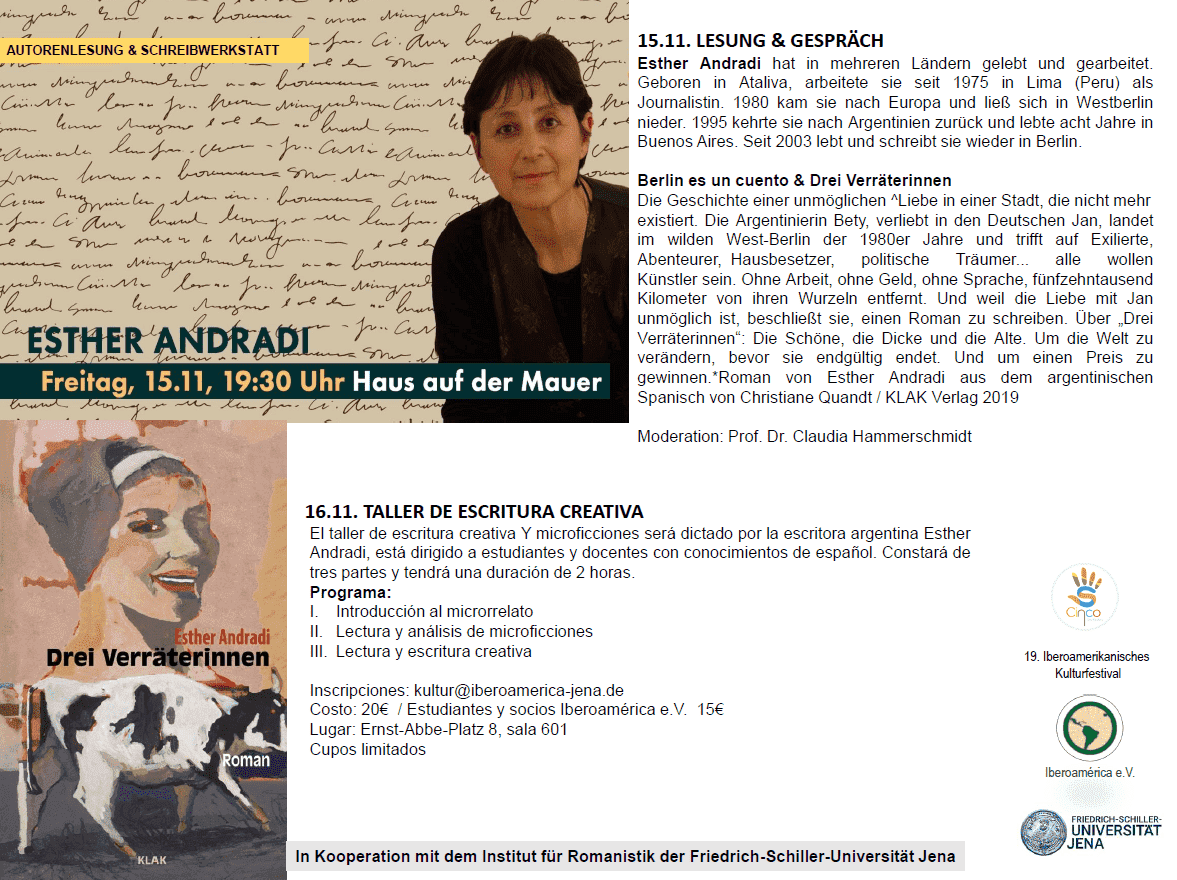 - 15.11.19, 19.30 Uhr Esther Andradi - Lesung und Gespräch (Haus auf der Mauer, Jena). Informationen zur Veranstaltung finden Sie hierpng, 774 kb.