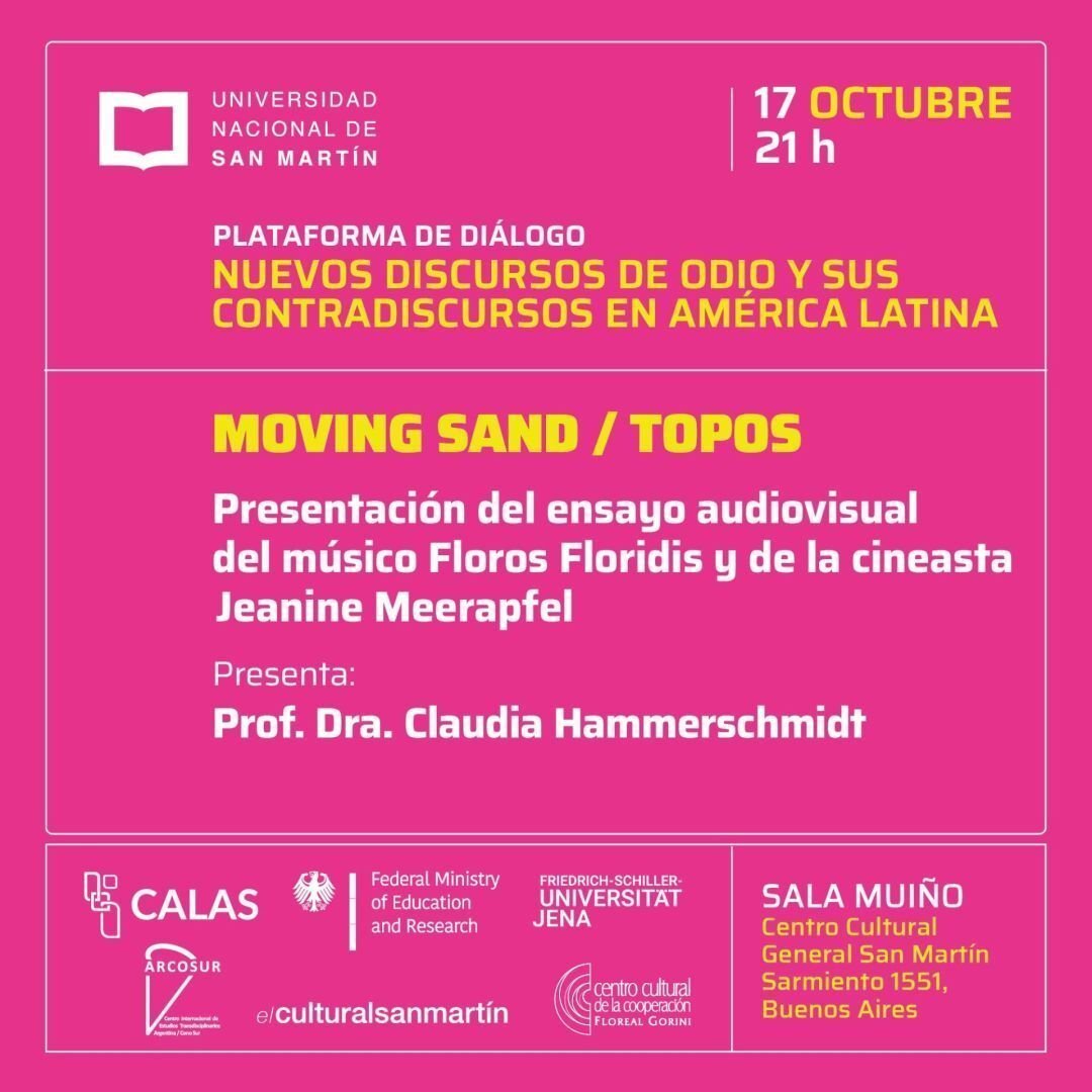MOVING SANDS / TOPOSjpeg, 118 kb. Vorstellung des ensayo audiovisual von Jeanine Meerapfel (Cineastin) und Floros Floridis (Musiker) im Rahmen der Plataforma de diálogo "Nuevos discursos de odio y sus contradiscursos en América Latina" an der UNSAM, Buenos Aires (Merian Calas / Arcosur)