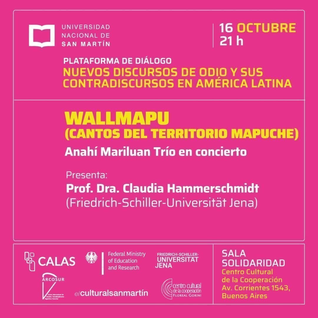 WALLMAPU - Cantos del territorio mapuchejpeg, 117 kb. Konzert des Anahí Mariluan Trío im Rahmen der Plataforma de diálogo "Nuevos discursos de odio y sus contradiscursos en América Latina" an der UNSAM, Buenos Aires (Merian Calas / Arcosur)
