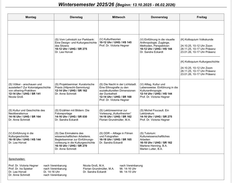 Übersichtsplan Wintersemester 2025/26 am Seminar für Kulturanthropologie und Kulturgeschichte.
