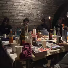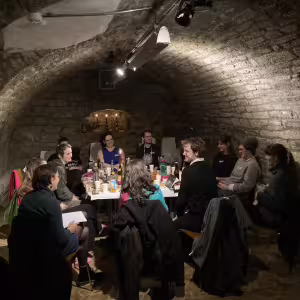 Bei Kerzenschein lasen sich die angehenden Schreibenden im Gewölbekeller Textpassagen vor. Nach Herricks Zeilen folgten Auszüge aus aktuellen Romanen – von juckenden Grindr-Dates über Siebträger-Schnack im österreichischen Dialekt bis hin zu dystopischen KI-Bestsellern. Auf dem Tisch lag eine Sammlung Thüringer Sagen, aber auch mal ein schmaler Lyrikband.