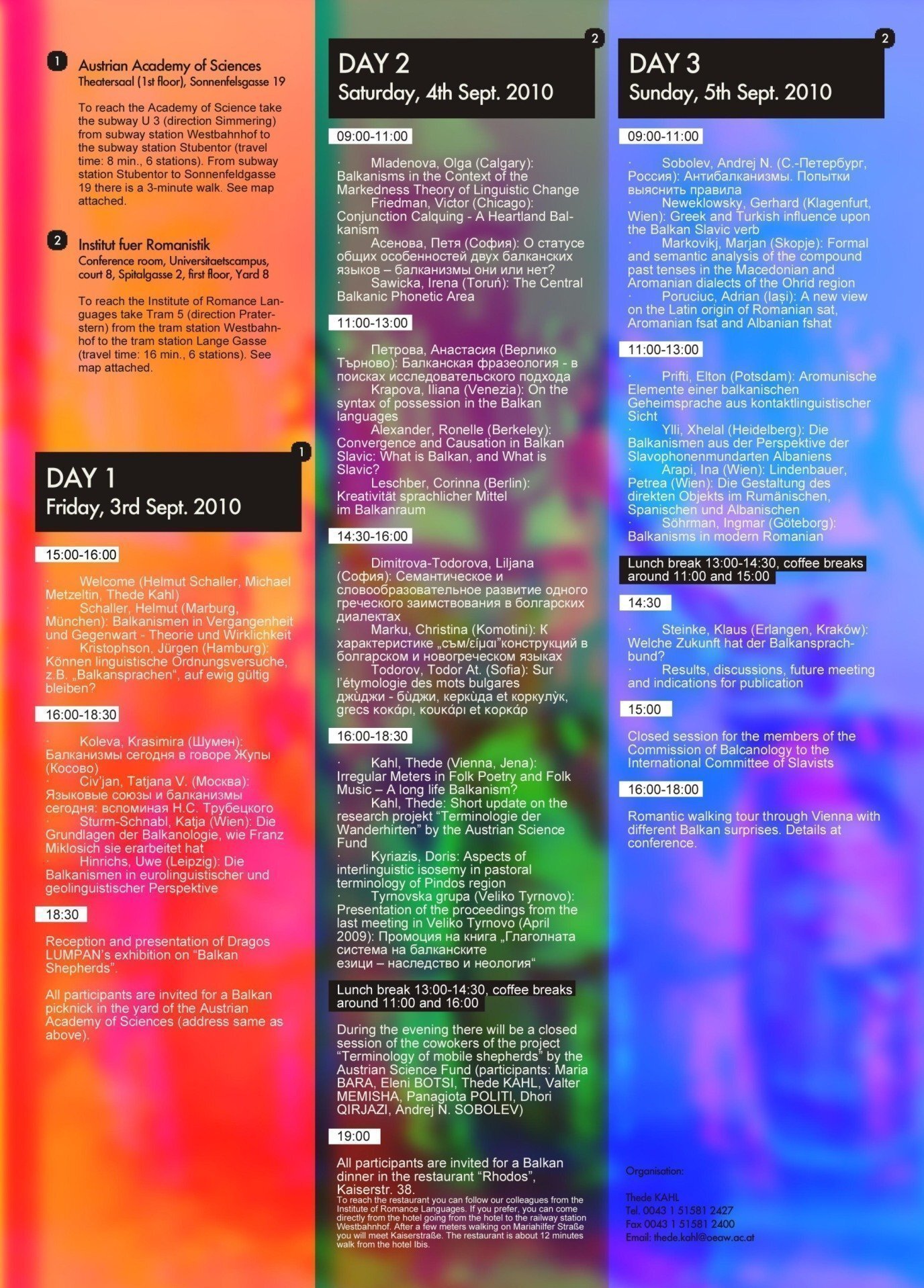 The international conference of the Commission for Balkan Linguistics at the International Committee of Slavists took place in Vienna from 3 to 5 September 2010. It was hosted by Prof. Dr. Thede Kahl and Prof. Dr. Michael Metzeltin, who organised the event in cooperation with the Institute of Romance Studies at the University of Vienna and the Austrian Academy of Sciences.