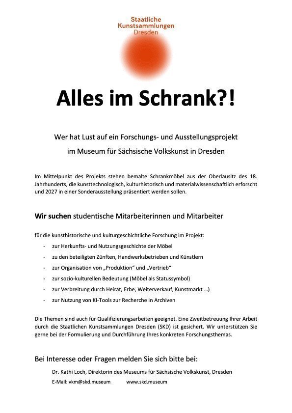 Die Staatlichen Kunstsammlungen Dresden suchen studentische Mitarbeiter*innen für das Forschungs- und Ausstellungsprojekt „Alles im Schrank!“ im Museum für Sächsische Volkskunst in Dresden.