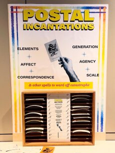 Mithilfe eines "Zauberbuchs" konnten Teilnehmende Zaubersprüche formulieren und ihre Adressat:innen dazu auffordern, sich den immanenten Gefahren entgegenzustellen, sie abzuwenden oder sich in Gruppen zu organisieren, um auf die drohenden globalen Katastrophen aufmerksam zu machen. Postal Incantations beschwörte also in zwei Weisen die Geister der Zukunft herauf: Zum einen als Mahnung gegen den rasant fortschreitenden Klimawandel und den Versäumnissen unserer Gegenwart und zum anderen einen Spirit der Solidarität innerhalb und außerhalb der Wissenschaften aktiv und aktivistisch aufzutreten.