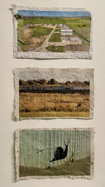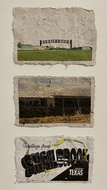 Greetings from Snailbrook, Texas hat sich diesem Dazwischen angenähert und nach den (Un-)Wirklichkeiten des Ortes gefragt. In mehreren kurzen Aufenthalten in Snailbrook und in der Boring Bodega haben wir Beobachtungsprotkolle, Gesprächsskizzen, Fotografien, Videomaterial sowie Flyer und weitere Informationsmaterialien gesammelt. Aus Flyern, Gräsern und Bauschutt aus Snailbrook haben wir Papier geschöpft, in Postkartengröße gebracht und mit digitalen Collagen aus den Fotografien bedruckt. Die Postkarten zeichnen eine Zukunftvision des Ortes, ein touristischer Sehnsuchtsort, eine Lebens- und Alltagswelt im Schatten des musk'schen Hyperkapitalismus.